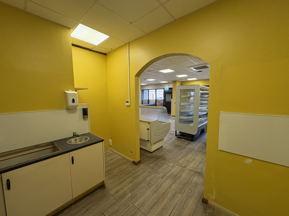The unit is open plan throughout, with a staff/prep kitchen to the rear, including a range of fitted units and a toilet. The flooring throughout is tiled with wood affect and the ceiling is suspended with LED lighting.